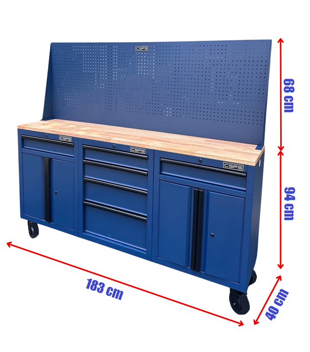 Set of 3 CSPS 183cm blue tool cabinets with wooden panel and mesh wall - 06 drawers