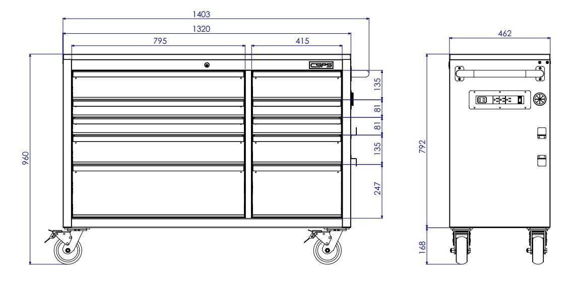 Includes 1 specialized drawer for charging cordless power tools.