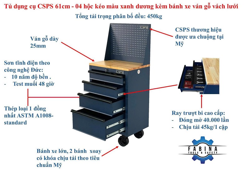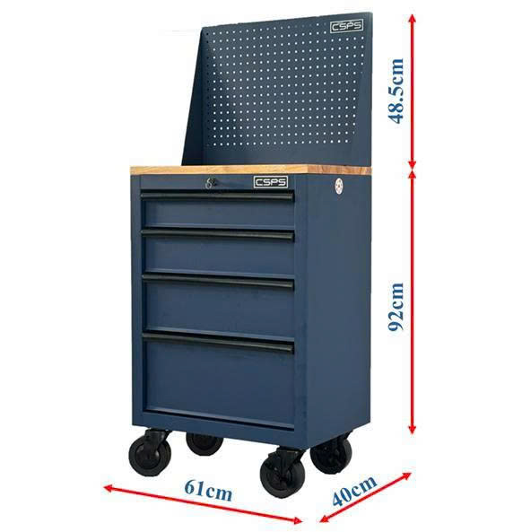 CSPS Blue tool cabinet 61cm include casters with wooden top and pegboard – 4 Drawers