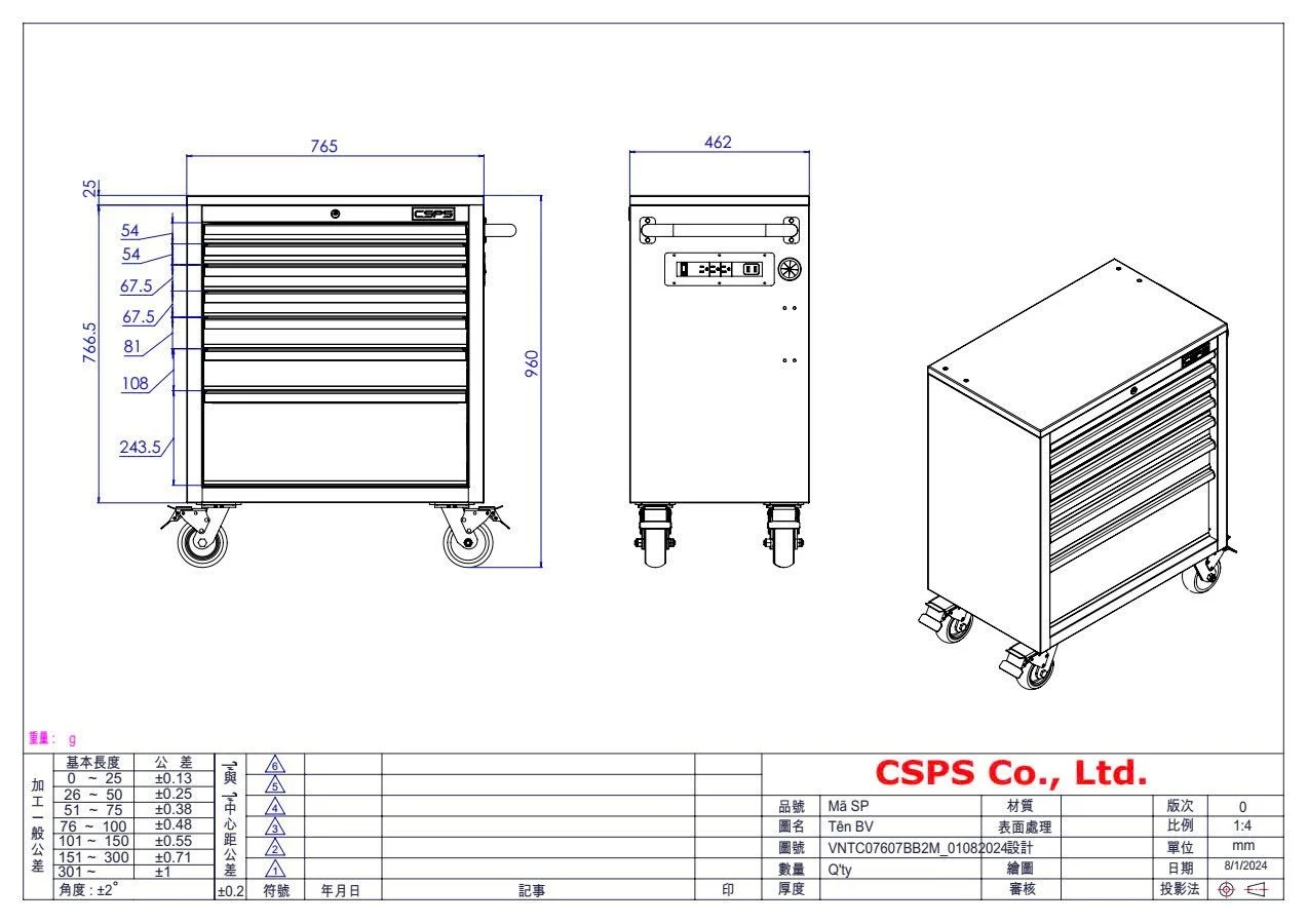 CSPS Tool Cabinet Matte Black with 7 Drawers with pegboard and wooden top