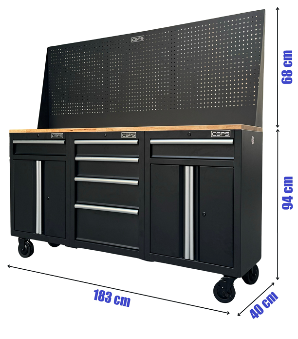 Bộ 3 Tủ dụng cụ CSPS 183cm màu đen mặt ván gỗ kèm vách lưới - 06 hộc kéo (tay cầm trắng)