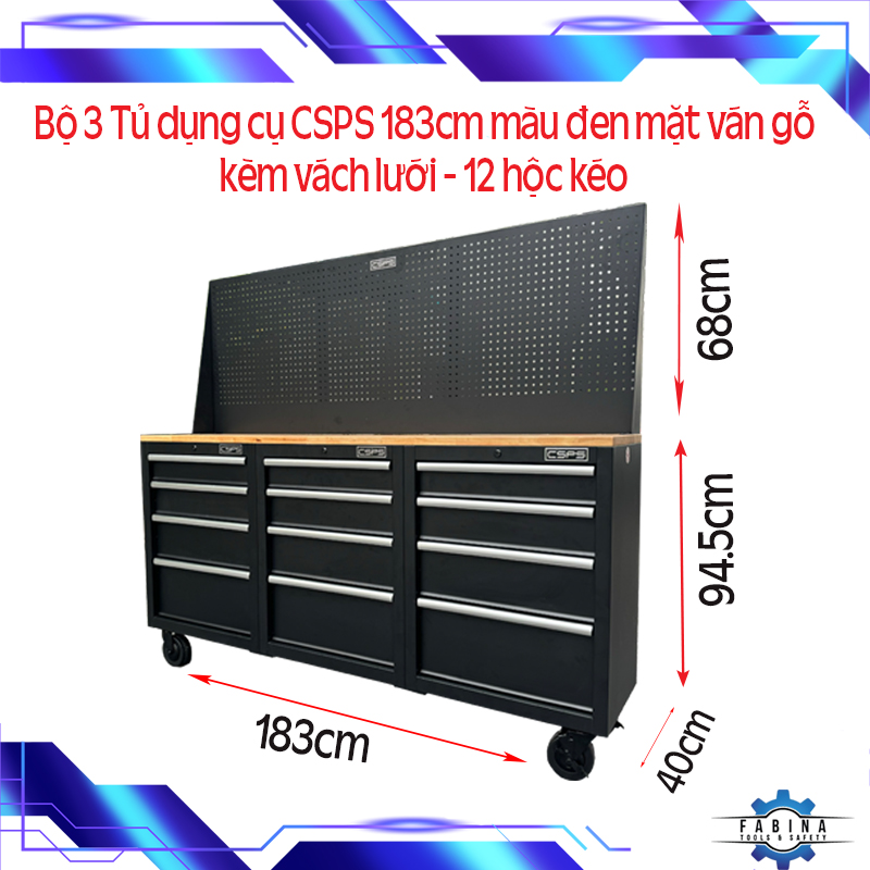 Bộ 3 Tủ dụng cụ CSPS 183cm màu đen mặt ván gỗ kèm vách lưới - 12 hộc kéo (tay cầm trắng)