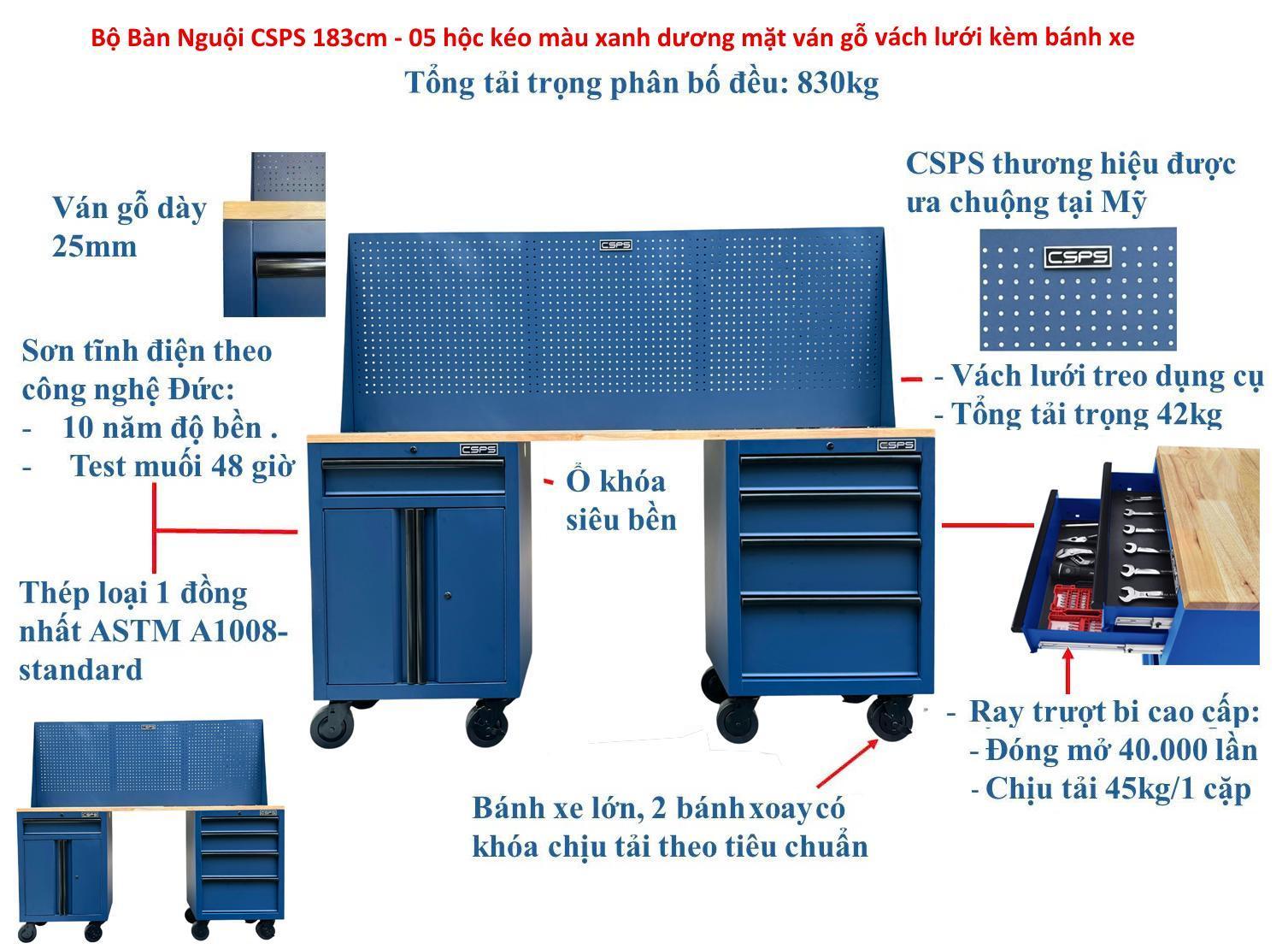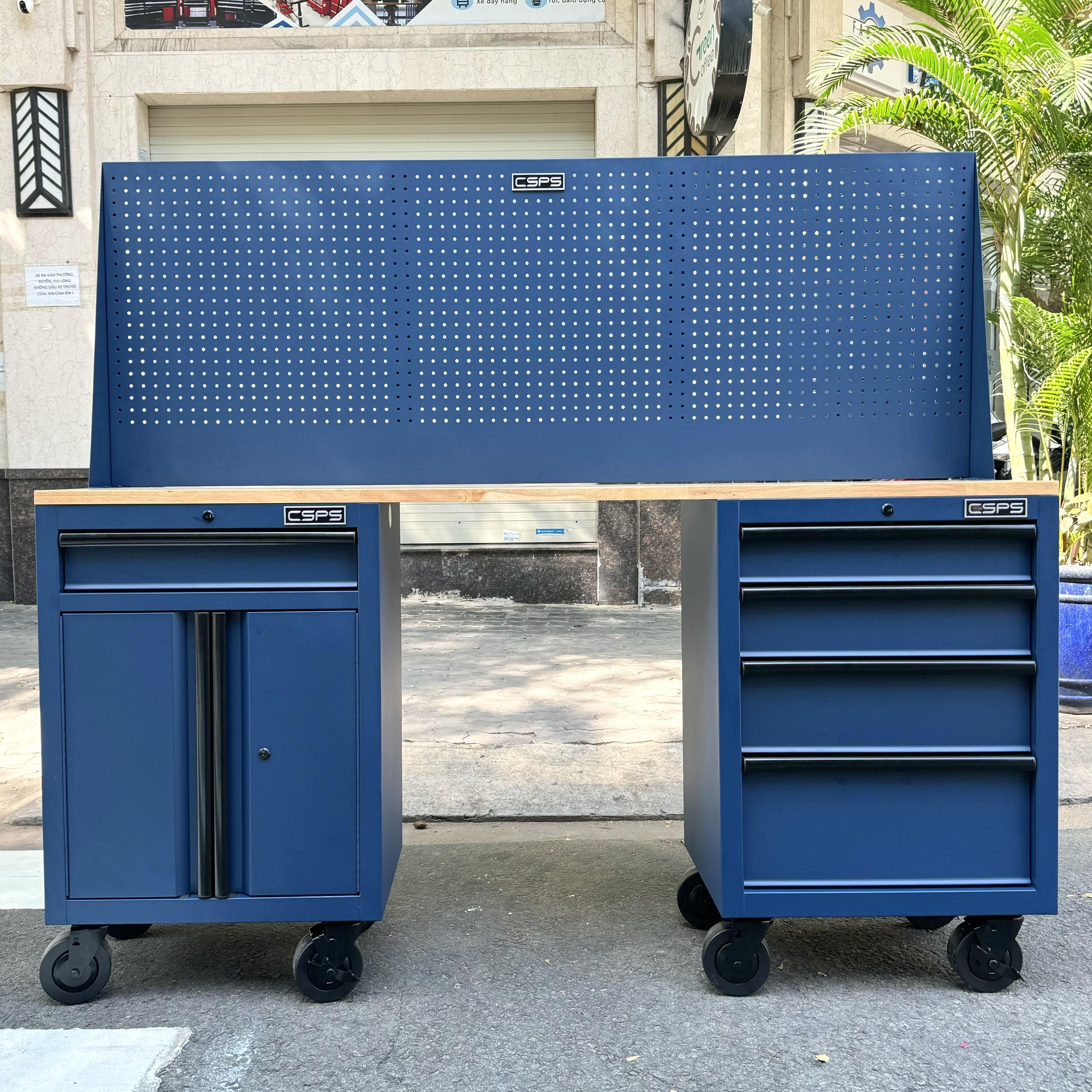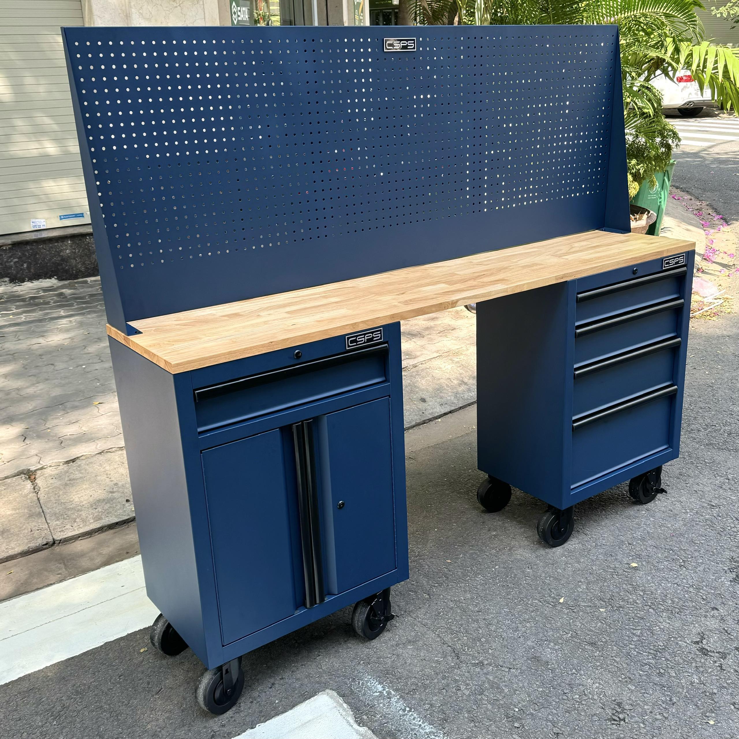 Bộ Bàn Nguội CSPS 183cm - 05 hộc kéo màu xanh dương mặt ván gỗ vách lưới kèm bánh xe