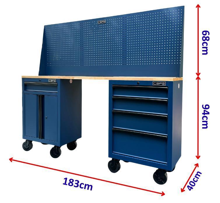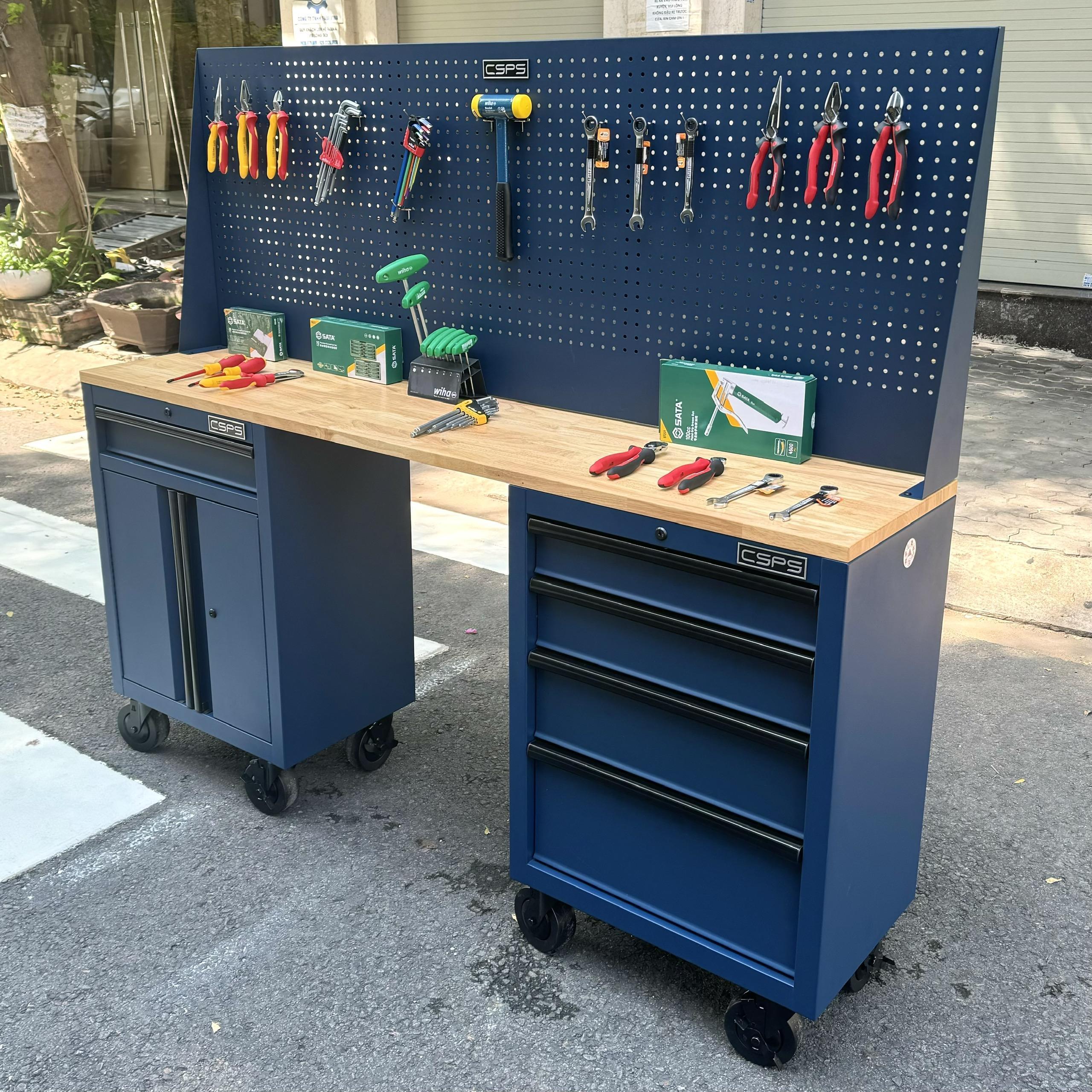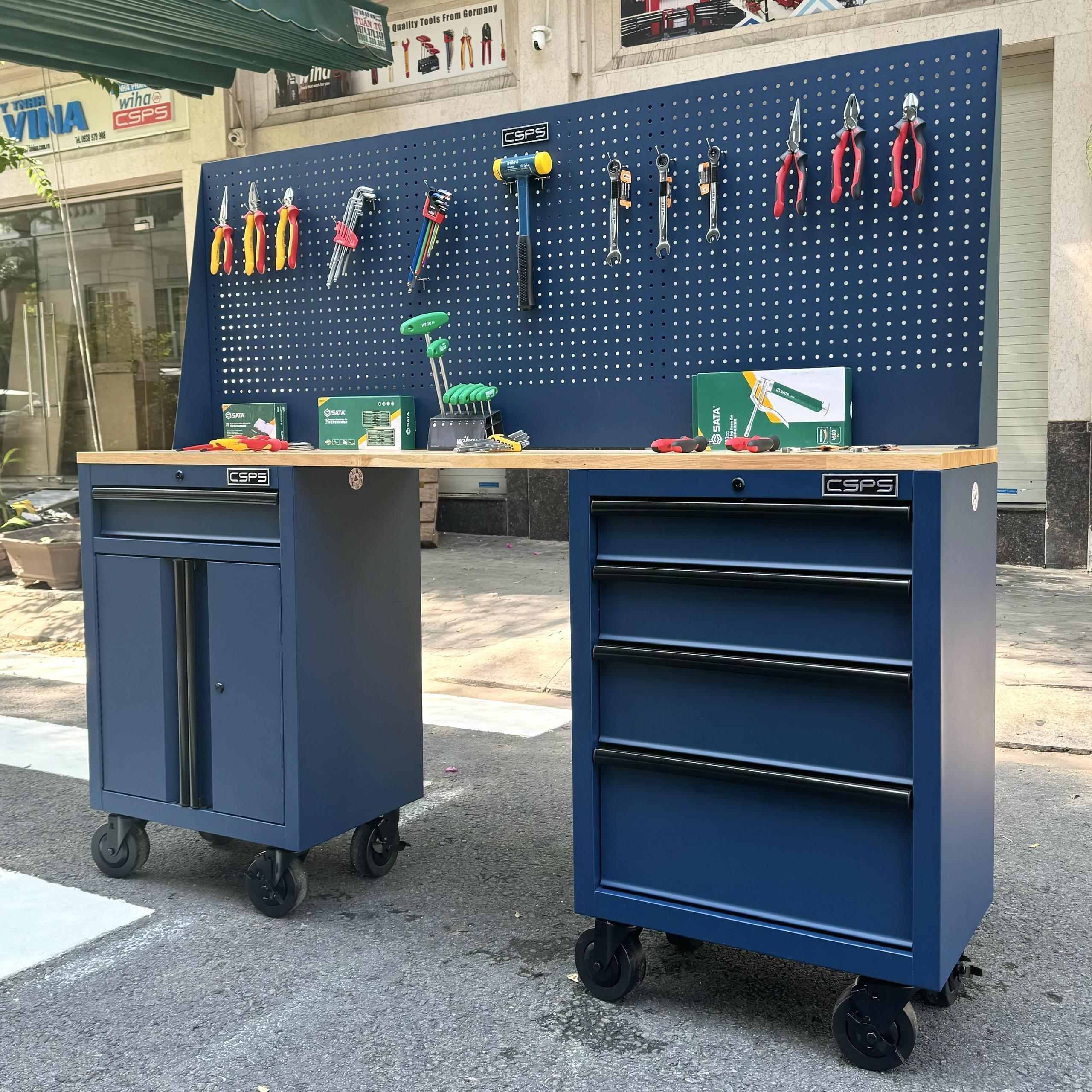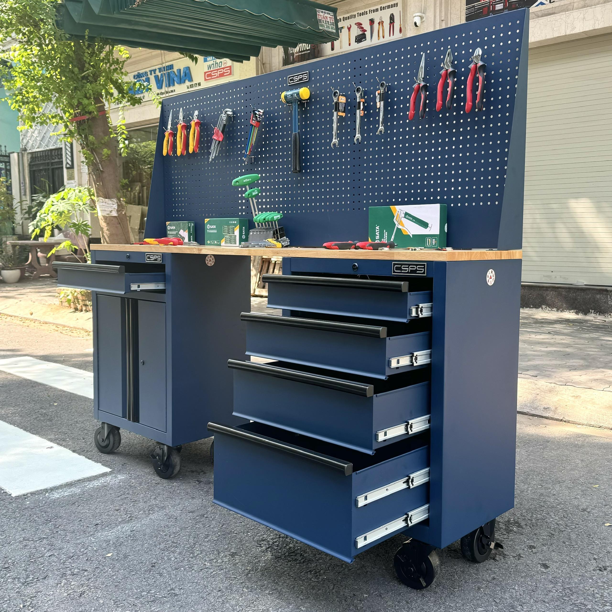 Bộ Bàn Nguội CSPS 183cm - 05 hộc kéo màu xanh dương mặt ván gỗ vách lưới kèm bánh xe