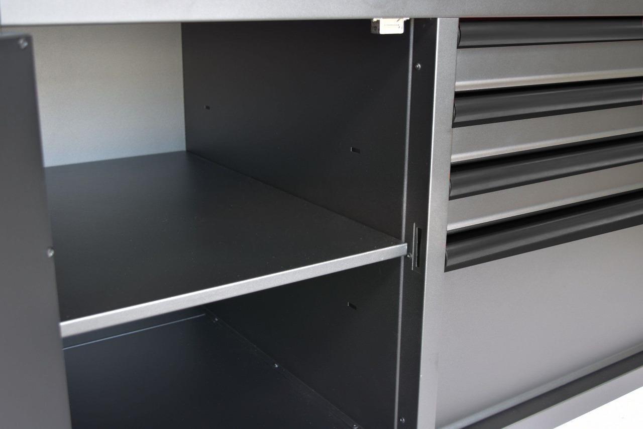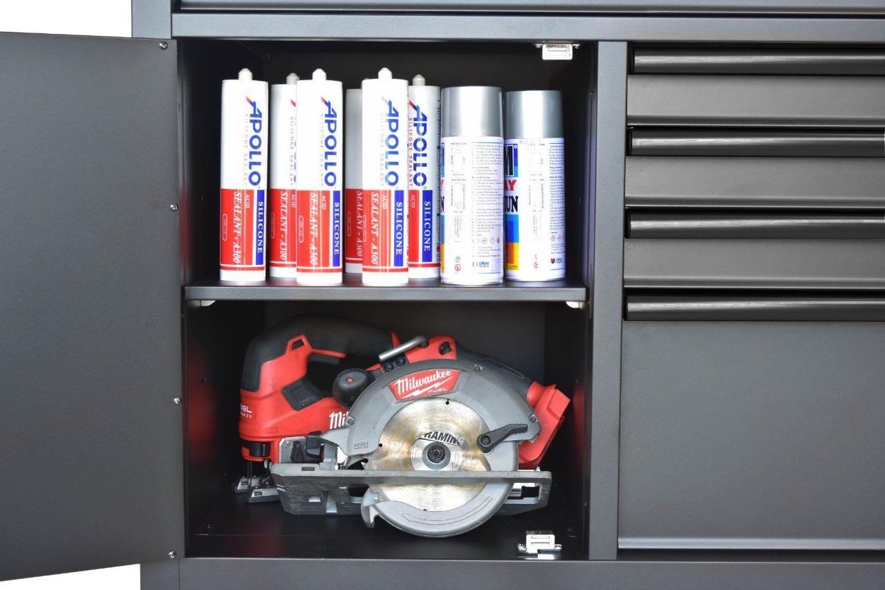 Tiết kiệm không gian làm việc thông qua việc kết hợp bàn nguội vào tủ dụng cụ. / Save working space by combining working table with tool cabinet.