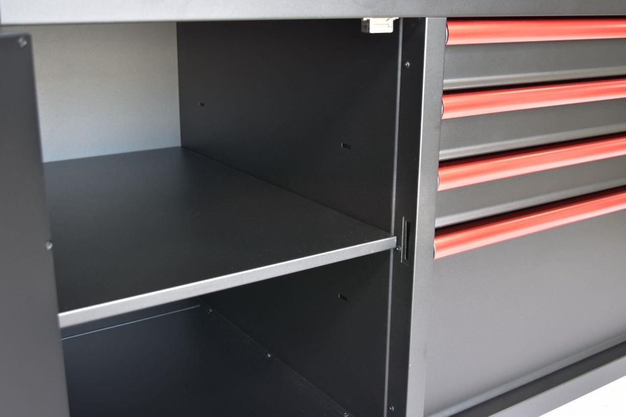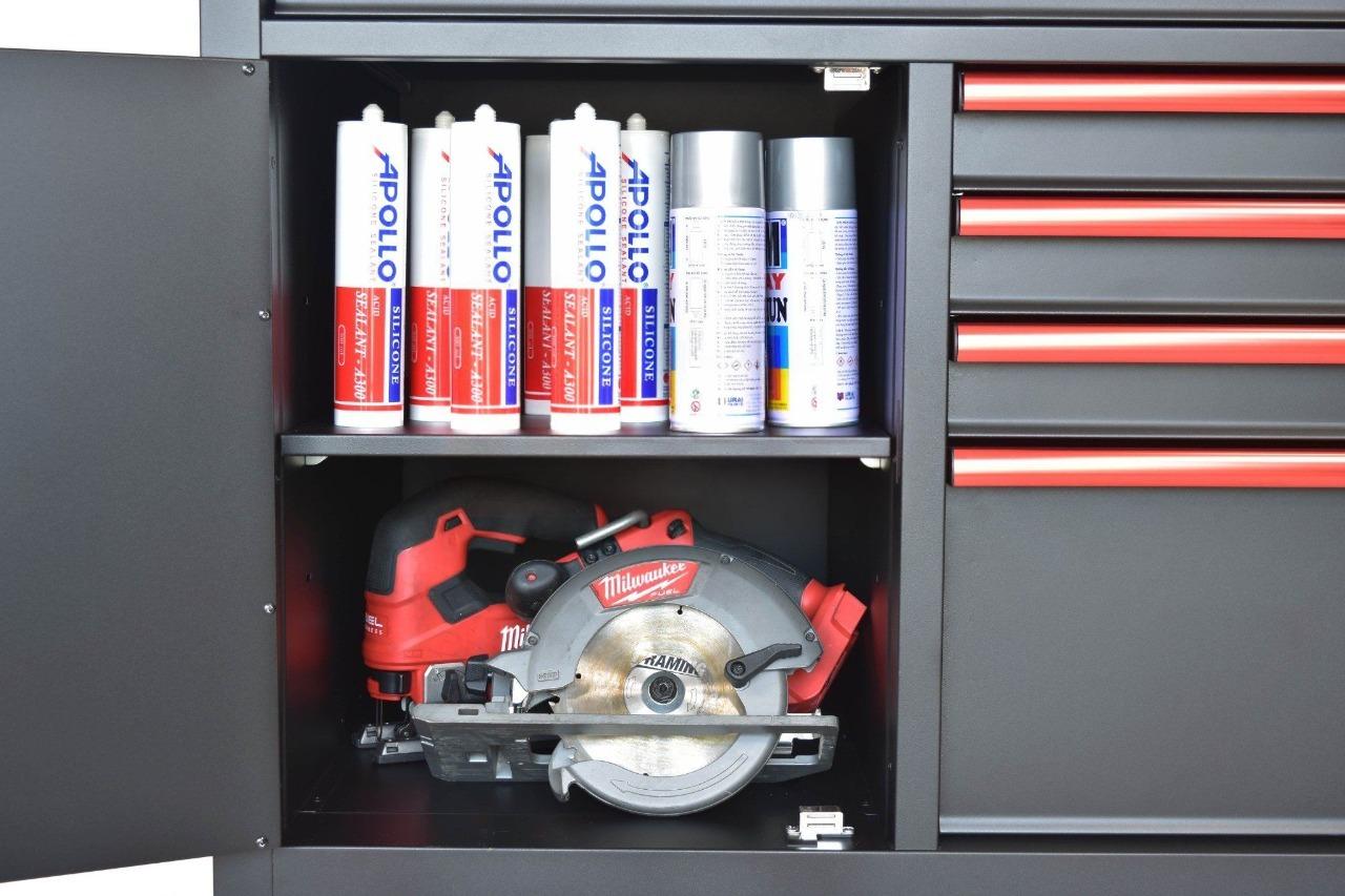 Tiết kiệm không gian làm việc thông qua việc kết hợp bàn nguội vào tủ dụng cụ. / Save working space by combining working table with tool cabinet.