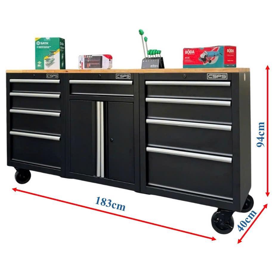 Tủ dụng cụ CSPS 183cm - 09 hộc kéo màu đen mặt ván gỗ (tay nắm trắng)