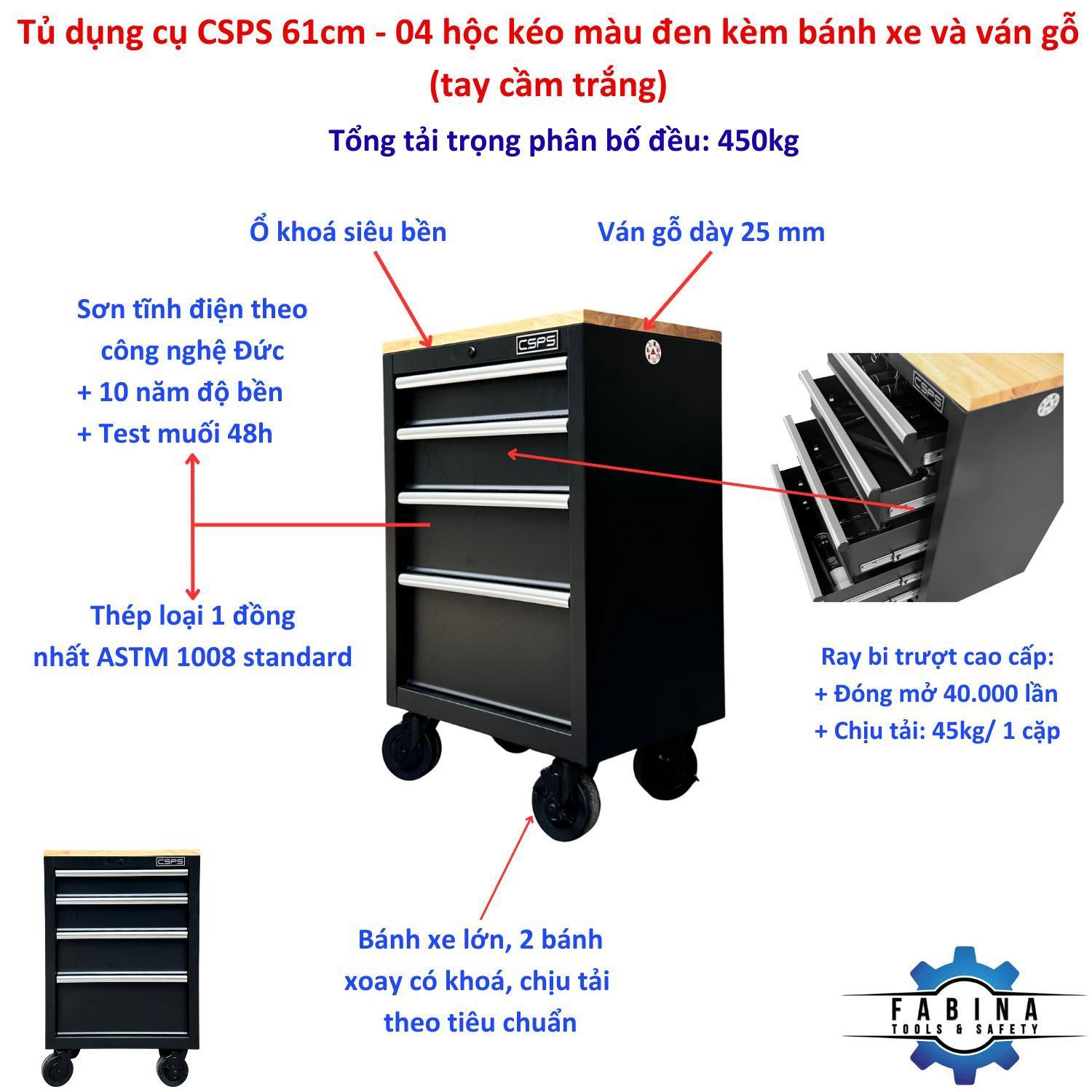 Tủ dụng cụ CSPS 61cm - 04 hộc kéo màu đen kèm bánh xe và ván gỗ (tay cầm trắng)