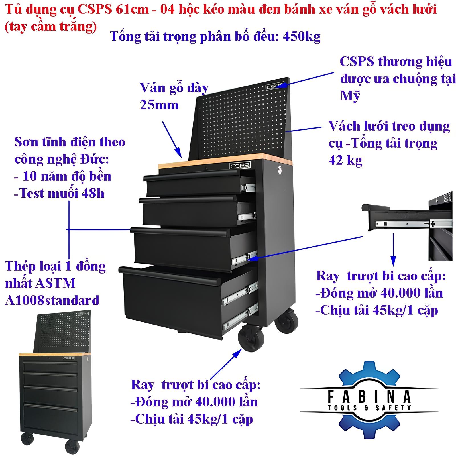 Tủ dụng cụ CSPS 61cm - 04 hộc kéo màu đen mặt ván gỗ kèm vách lưới