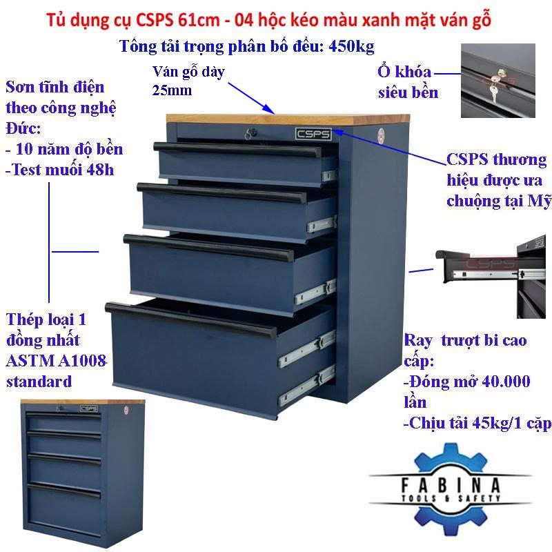 Tủ dụng cụ CSPS 61cm - 04 hộc kéo màu xanh dương kèm mặt ván gỗ