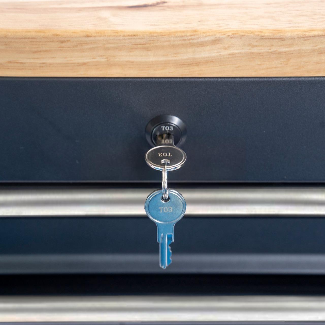 Tiết kiệm không gian làm việc thông qua việc kết hợp bàn nguội vào tủ dụng cụ. / Save working space by combining working table with tool cabinet.