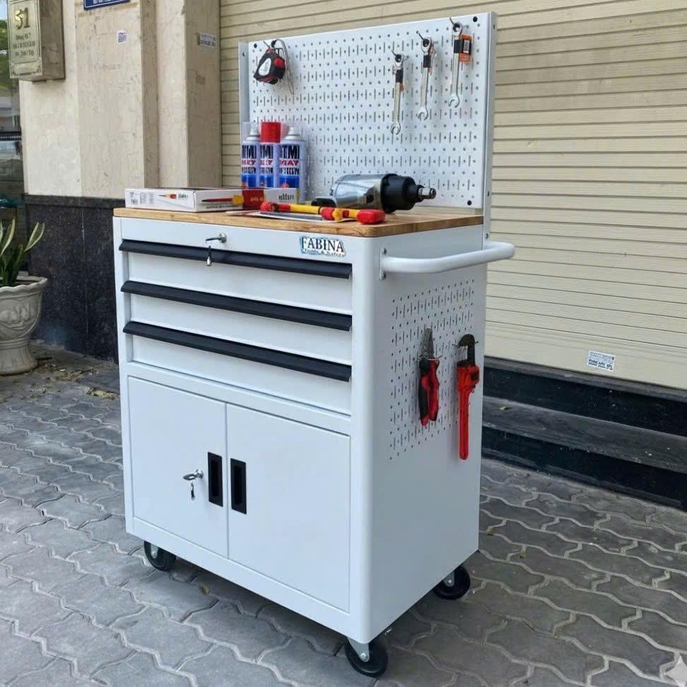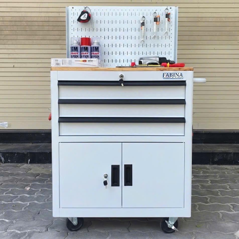 Tủ dụng cụ 3 hộc kéo 2 ngăn chứa màu trắng kèm vách lưới Fabina
