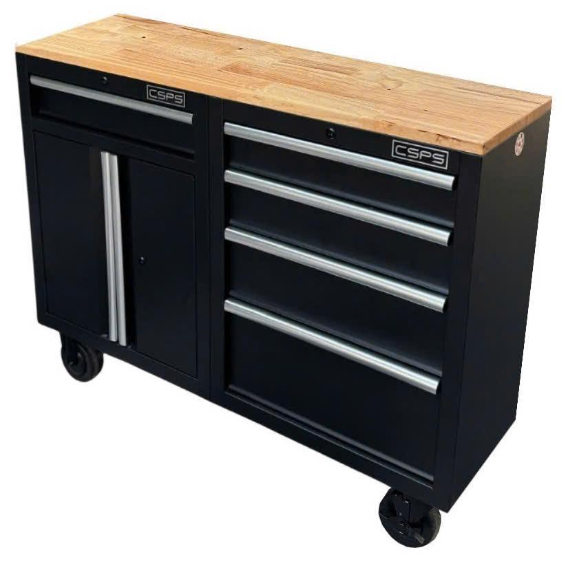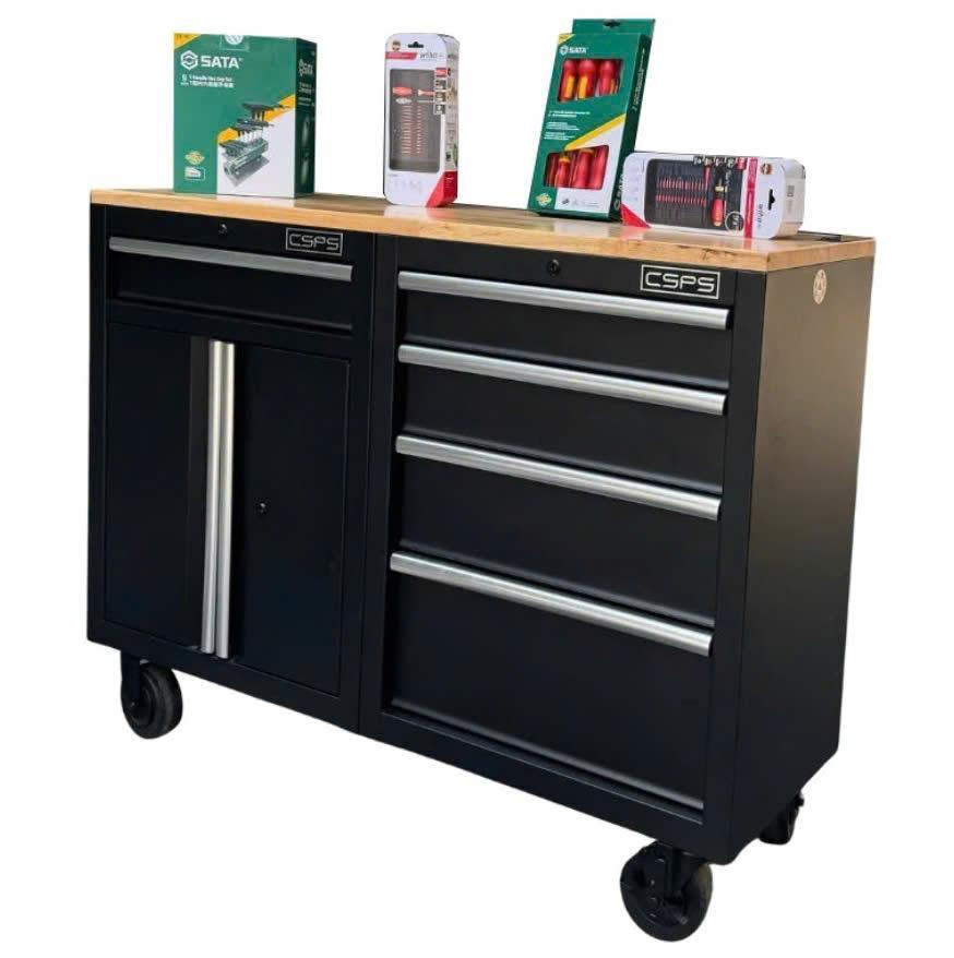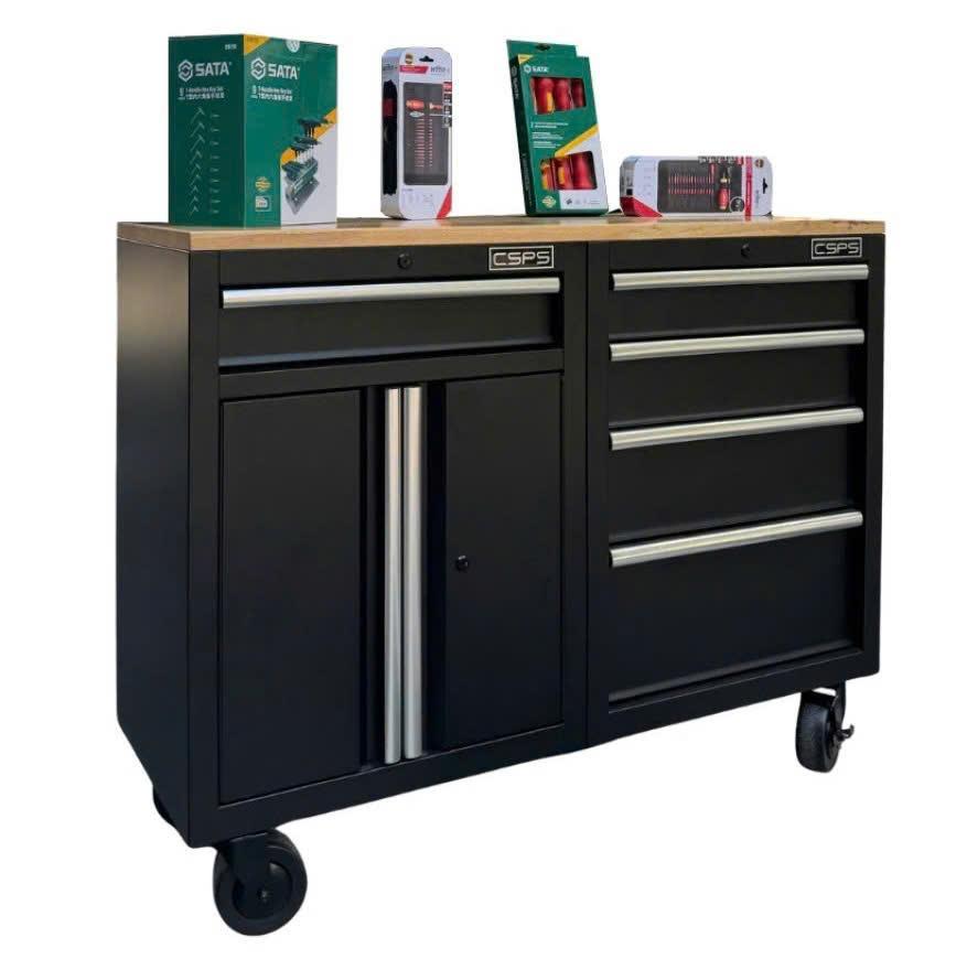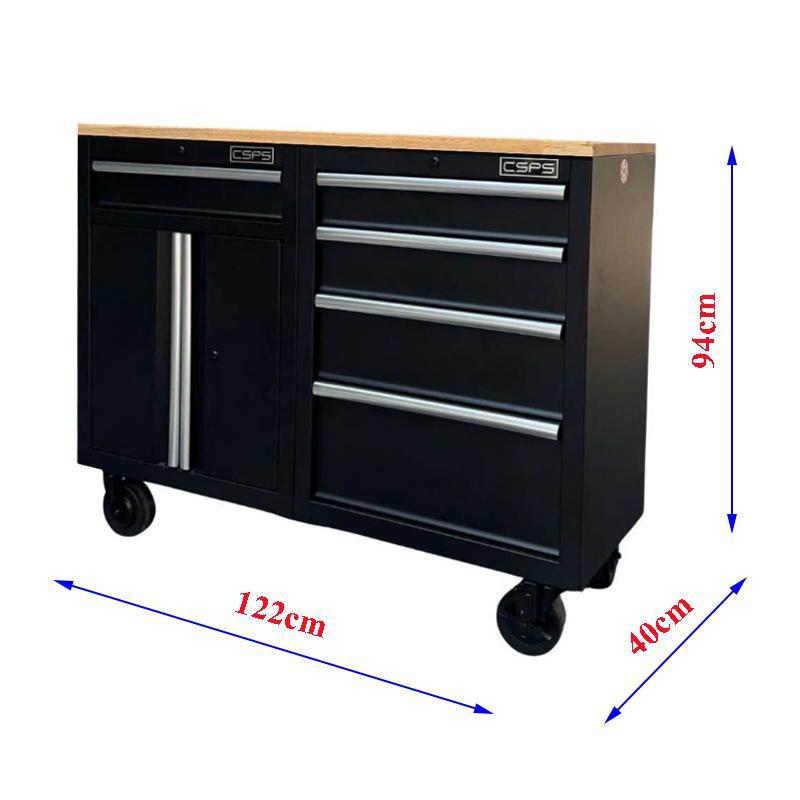 Set of 2 CSPS 122cm black tool cabinets with wooden surface and mesh wall - 05 drawers (white handle)