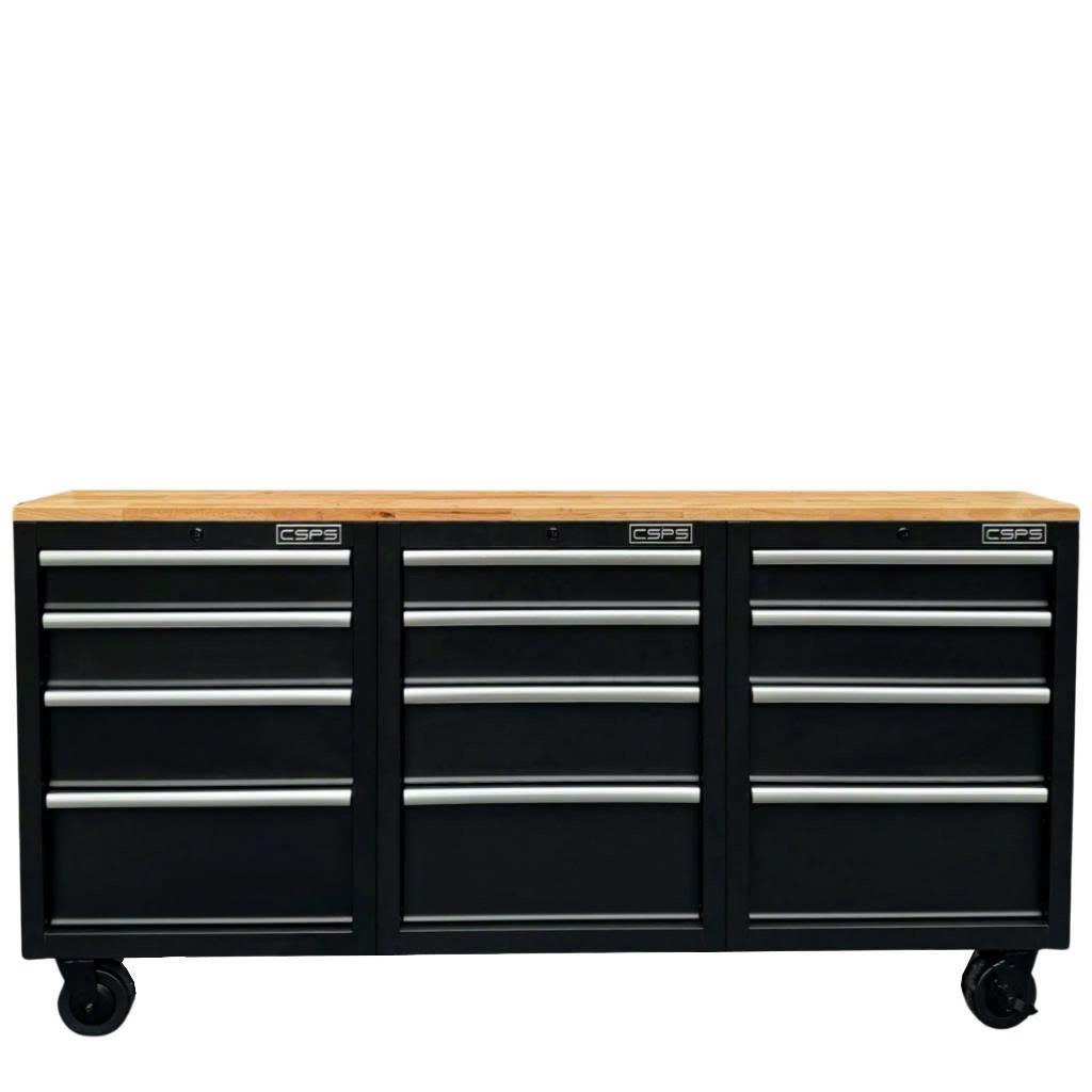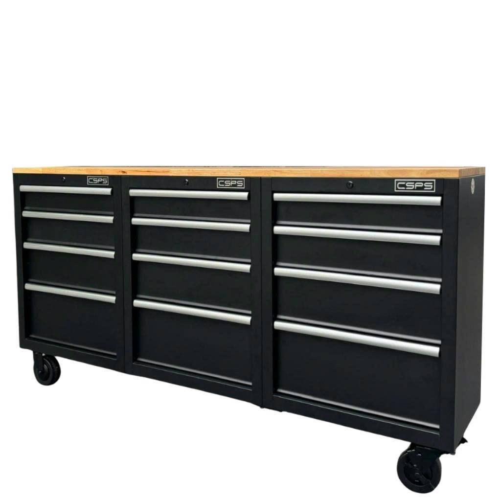 Set of 3 CSPS 183cm black tool cabinets with wooden panel - 12 drawers (white handle)