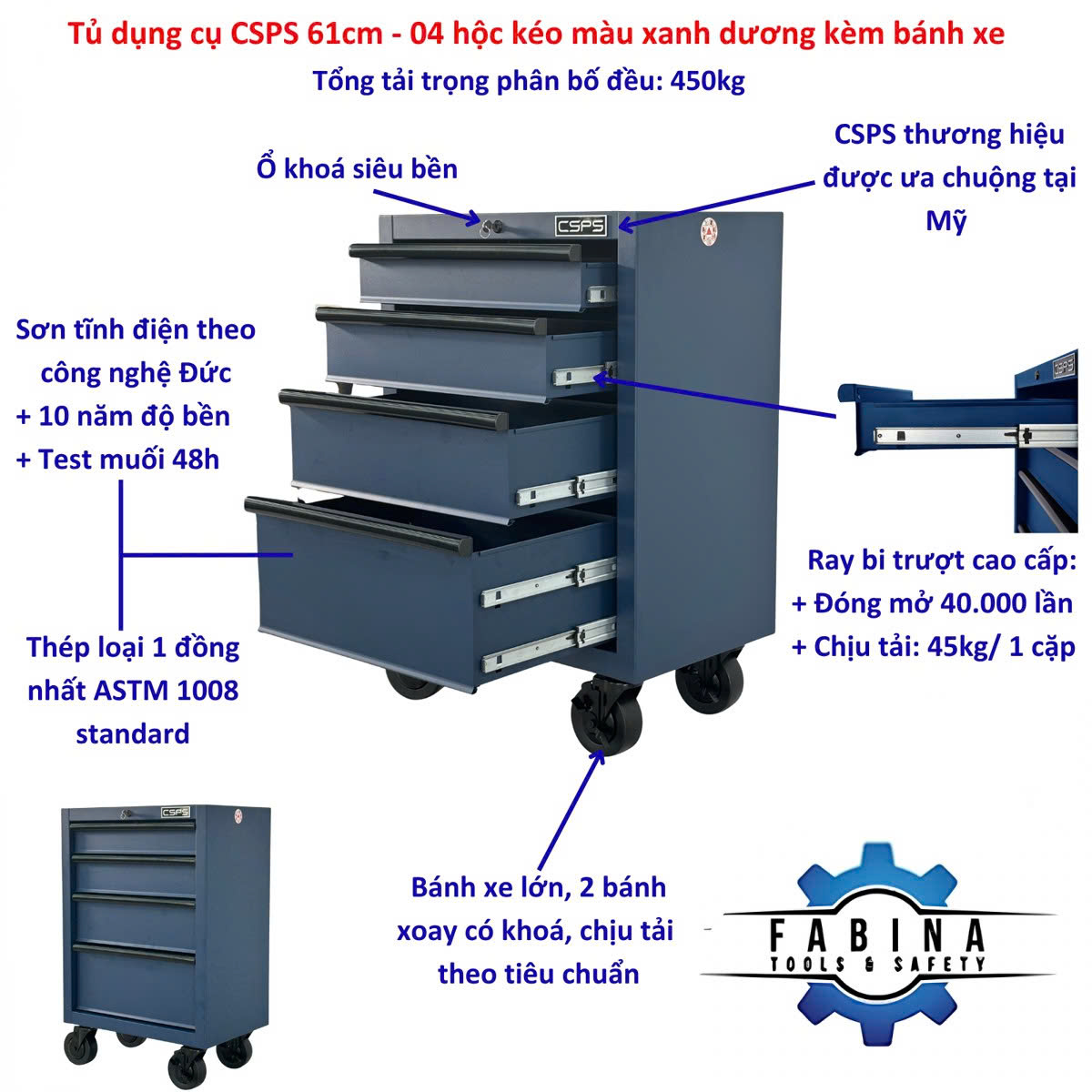 CSPS Matt Blue tool cabinet 61cm - 04 drawers with casters