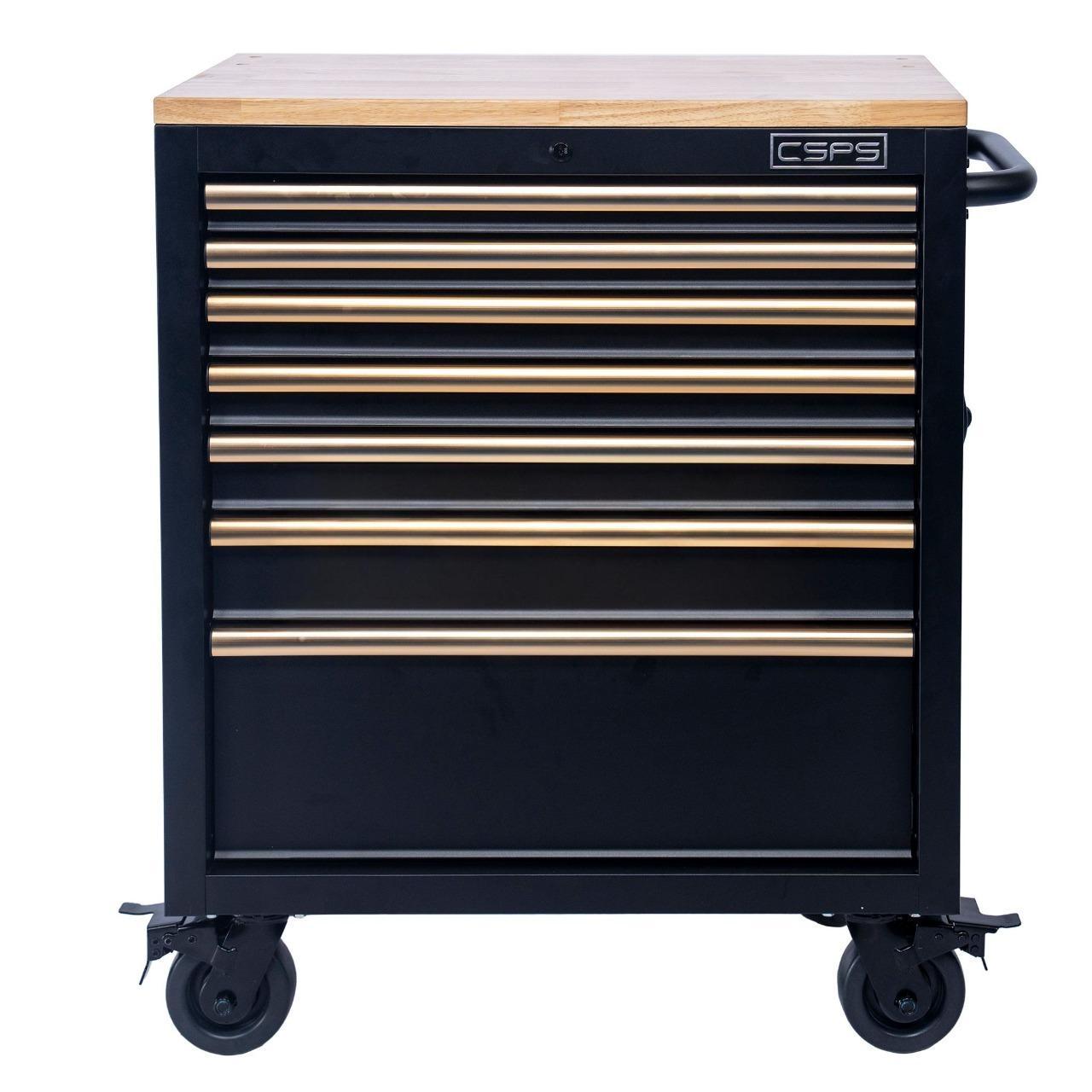 Set of 2 CSPS 122cm black tool cabinets with wooden surface and mesh wall - 05 drawers (white handle)