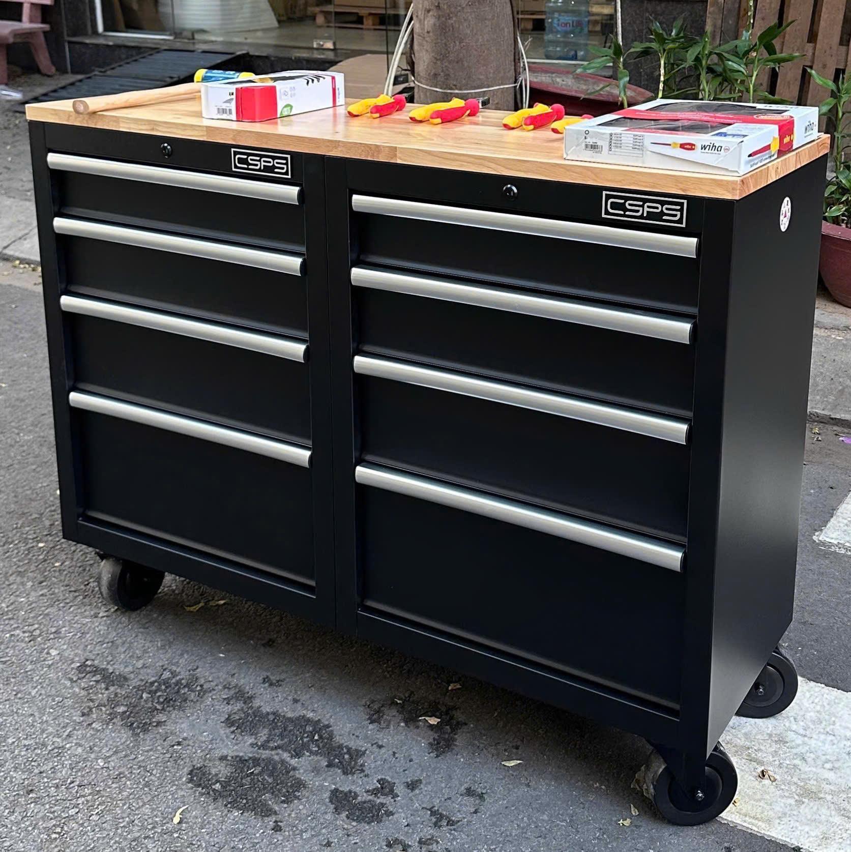Tủ dụng cụ CSPS 122cm - 08 hộc kéo màu đen tay cầm trắng mặt ván gỗ