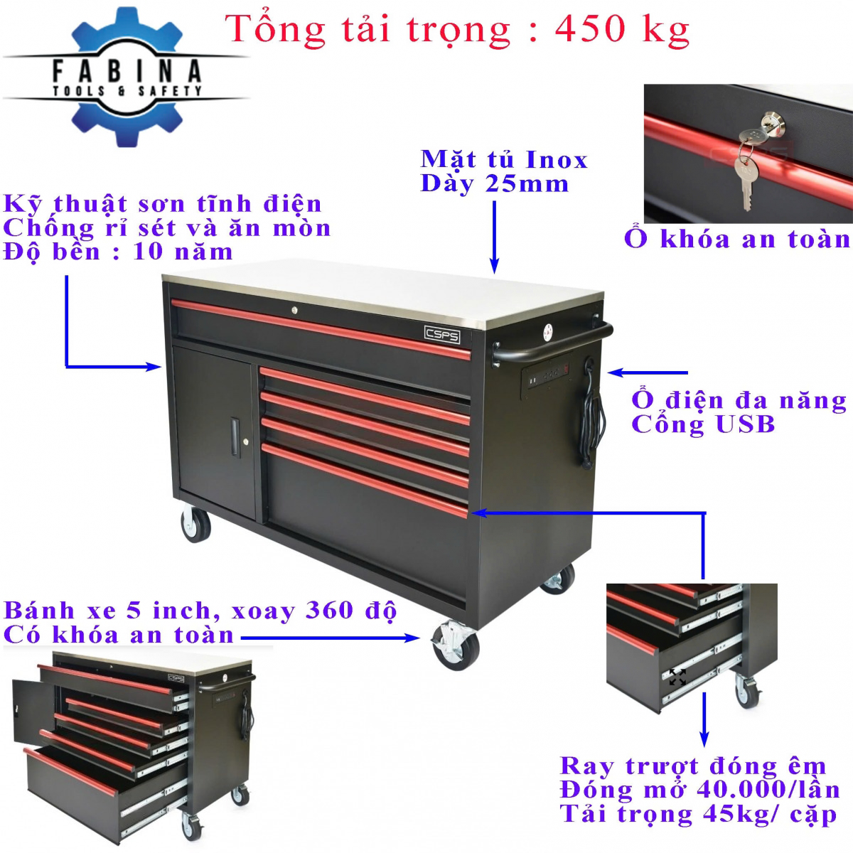 Tủ dụng cụ Tủ dụng cụ CSPS 132cm - 05 hộc kéo màu đen là một thiết kế mới của CSPS dành riêng cho người thợ Việt Nam với các lợi ích nổi bật: / CSPS tool cabinet 132 cm – 05 drawers are a new design of CSPS specialized for Vietnamese with outstanding benefits:
