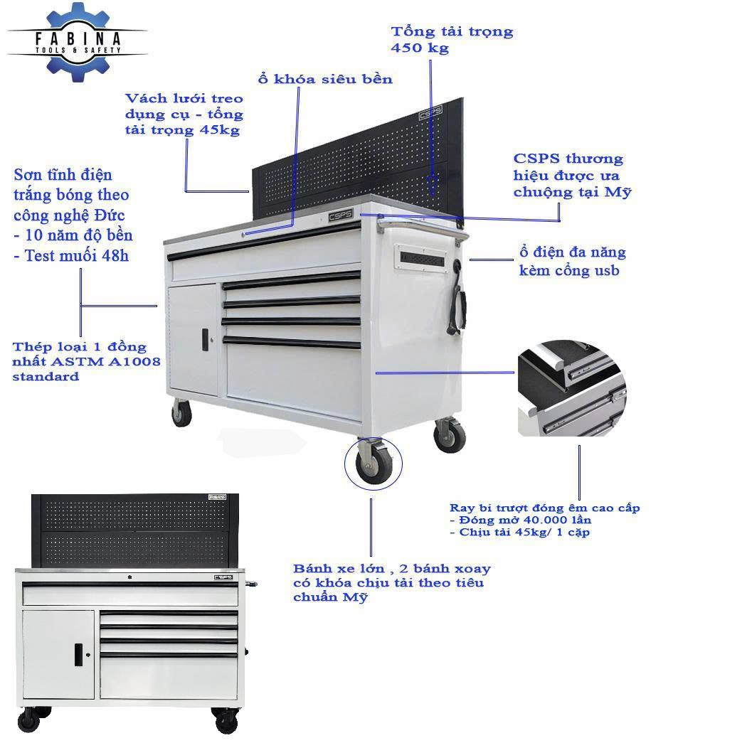 Tủ dụng cụ Tủ dụng cụ CSPS 132cm - 05 hộc kéo màu trắng là một thiết kế mới của CSPS dành riêng cho người thợ Việt Nam với các lợi ích nổi bật: / CSPS tool cabinet 132 cm – 05 drawers are a new design of CSPS specialized for Vietnamese with outstanding benefits: