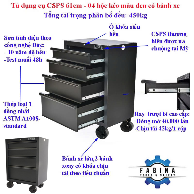 Tủ dụng cụ CSPS 61cm - 04 hộc kéo màu đen có bánh xe