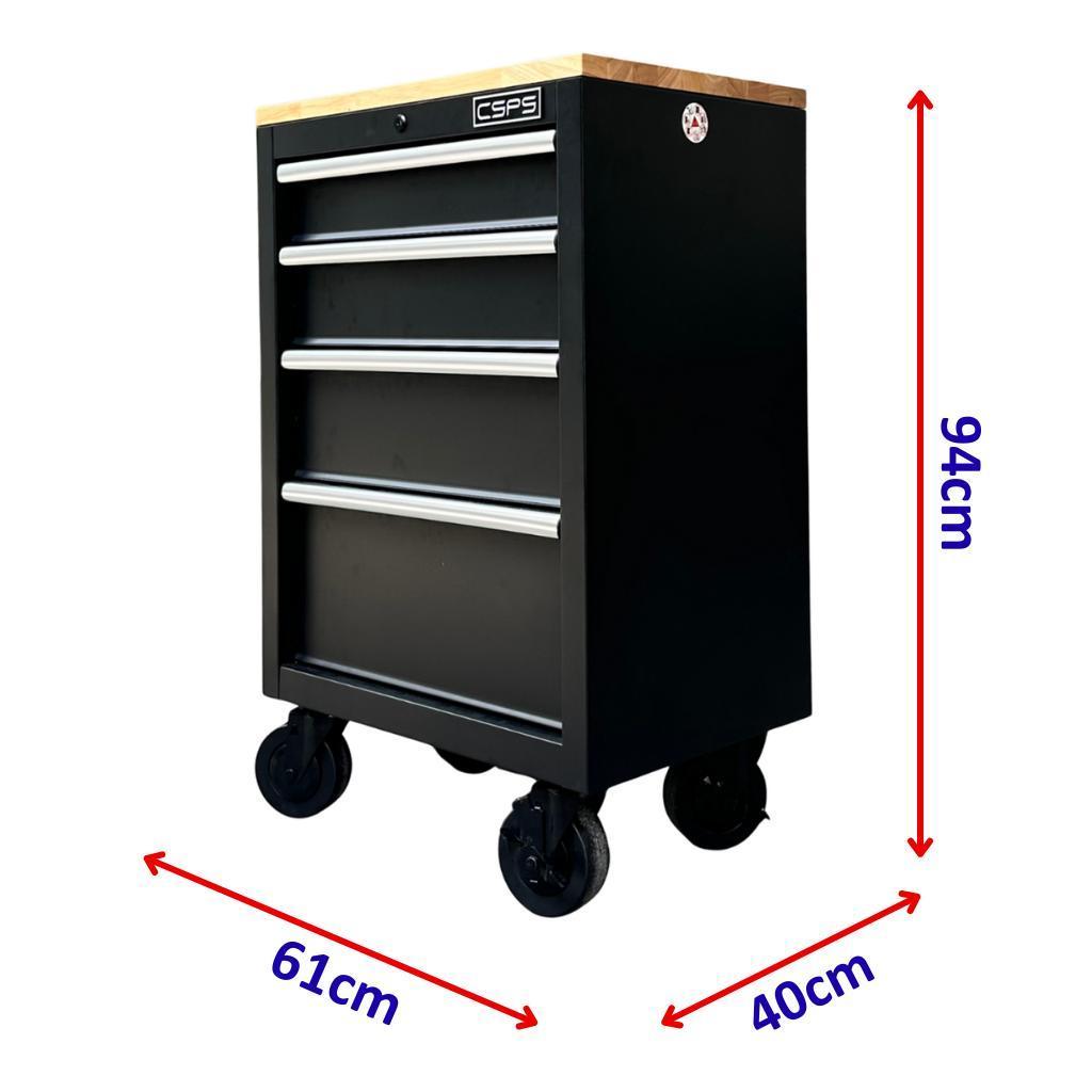 Tủ dụng cụ CSPS 61cm - 04 hộc kéo màu đen kèm bánh xe và ván gỗ (tay cầm trắng)