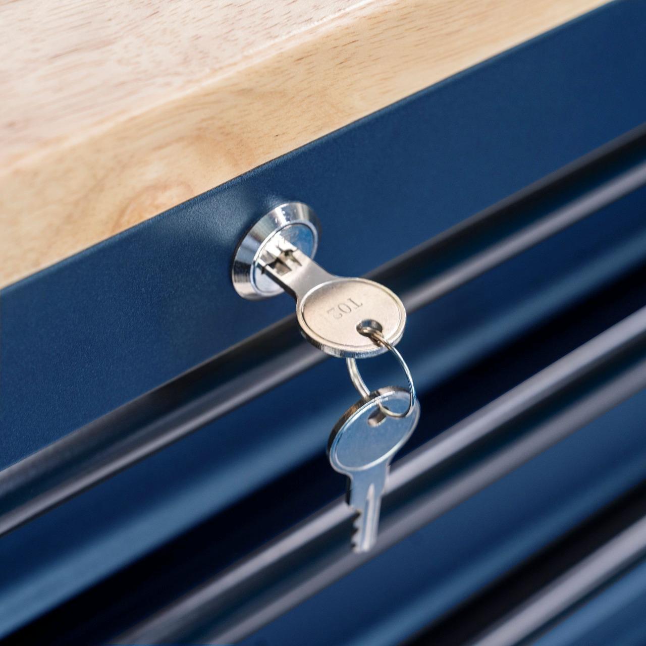 Tiết kiệm không gian làm việc thông qua việc kết hợp bàn nguội vào tủ dụng cụ. / Save working space by combining working table with tool cabinet.