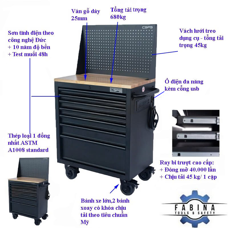 Tủ dụng cụ CSPS 76 cm kết hợp vách lưới – 07 hộc kéo là một thiết kế mới của CSPS dành riêng cho người thợ Việt Nam với các lợi ích nổi bậc: / CSPS tool cabinet 76 cm – 07 drawers is a new design of CSPS specialized for Vietnamese with outstanding benefits: